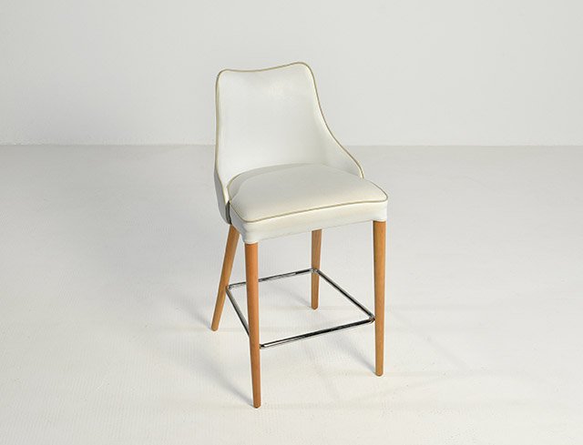 Banqueta de estructura metálica, con patas de madera maciza. Asiento y respaldo tapizado. Las terminaciones son a elección. Altura al asiento: 64cm