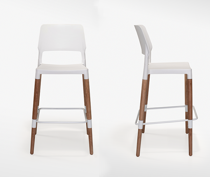 Respaldo y Asiento en polipropileno. Patas cónicas en madera de Ø 40 mm. Posapiés en tubo de acero de Ø 16 mm con terminación esmalte en polvo polyester en 11 colores.