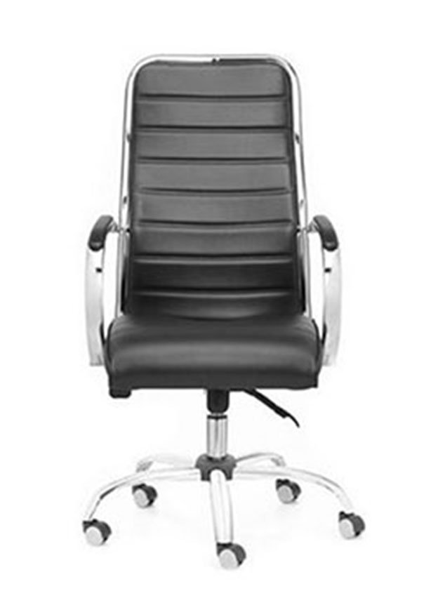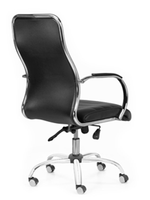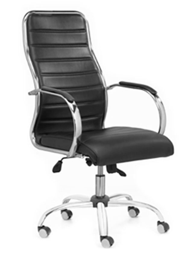 Tapizado en tela o ecocuer, espuma de alta densidad, estructura cromada con apoyabrazos. Sistema basculante con múltiples posiciones de bloqueo y regulación neumática de altura del asiento.