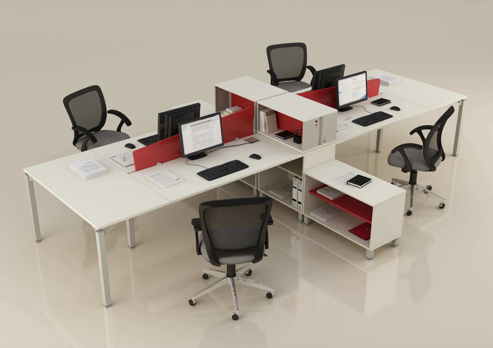 La gran variedad de muebles y accesorios, dan una impronta personal a las áreas de trabajo, como así también excelentes soluciones funcionales y estéticas, pudiéndose generar complejas configuraciones o puestos de trabajo individuales.