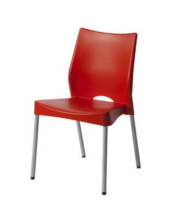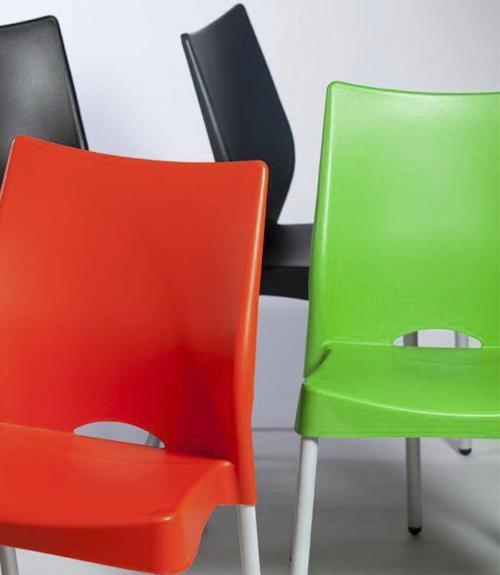 Monocasco inyectado en homopolimero. Base de caño de acero cubierto con pintura epoxi microtexturada color gris. Perfectamente apilables.