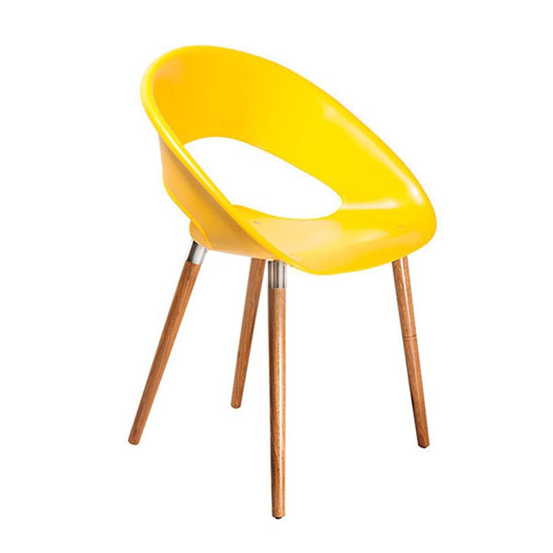 Silla de diseño moderno y liviana. Posee monocasco en homopolímero de alto impacto brillante y estructura fija con patas de madera torneada.