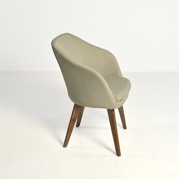Silla con apoyabrazos, patas de madera maciza, asiento y respaldo tapizado. Las terminaciones son a elección.