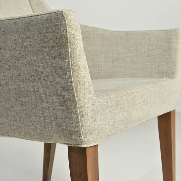 Silla con apoyabrazos, patas de madera maciza, asiento y respaldo tapizado. Las terminaciones son a elección.